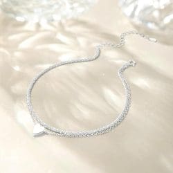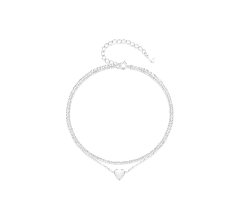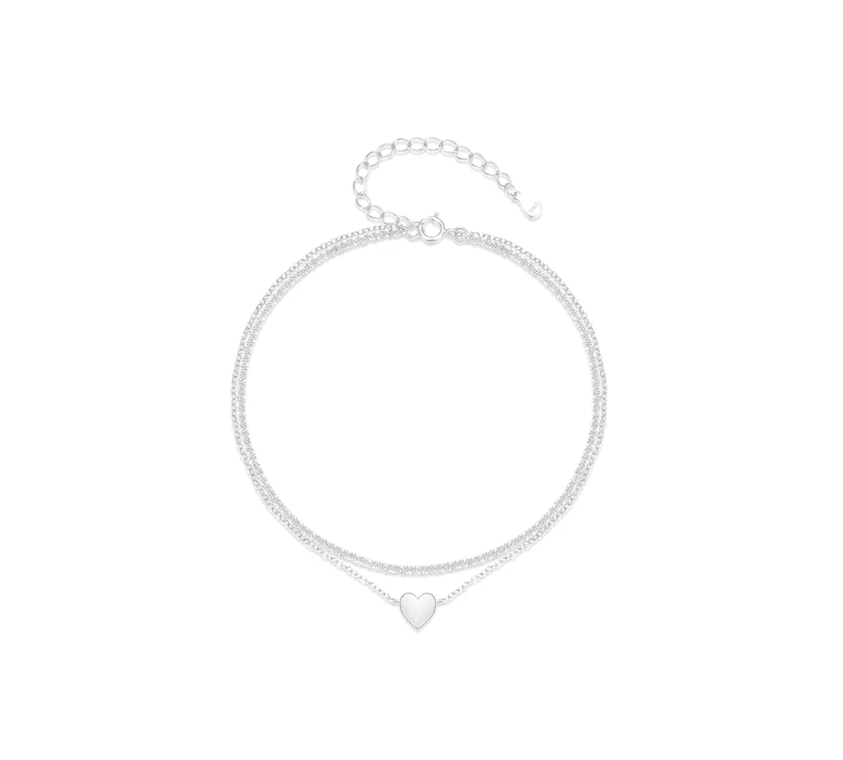 Această brățară de picior se remarcă prin structura sa dublă, care creează un efect stratificat elegant în jurul gleznei. Cele două lanțuri fine se completează armonios, iar inimioara decorativă devine punctul central al designului.