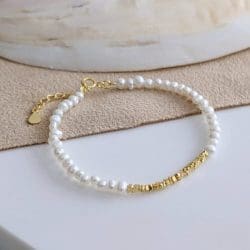 Această brățară Diora se face remarcată prin combinația cutre elementele aurii și detaliile inspirate cu forma perlelor, care creează un efect vizual delicat și bine definit. Fiecare componentă contribuie la un design coerent, cu un aer feminin și modern.