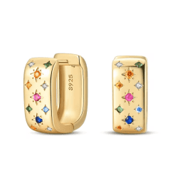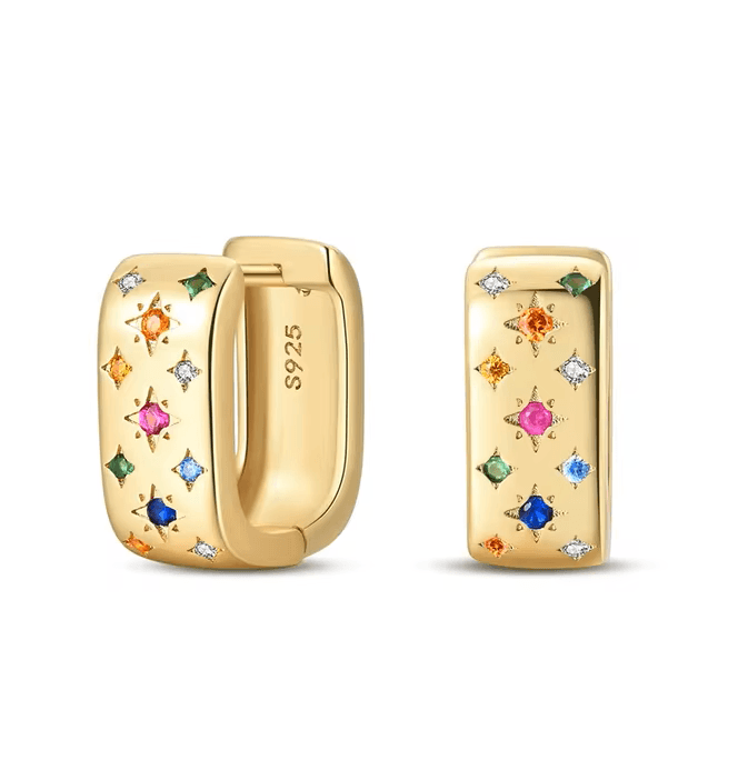 Descoperă acești cercei eleganți și veseli, placati cu argint, cu un design modern și detalii multicolore care captează lumina la fiecare mișcare. Placarea aurie adaugă o notă sofisticată, în timp ce micile stele colorate creează un efect vizual jucăuș și rafinat.