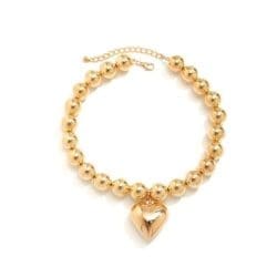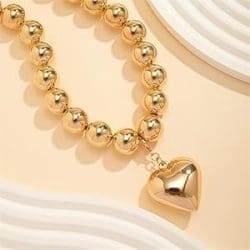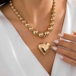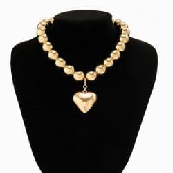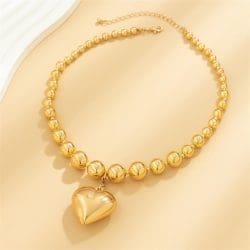 Adaugă un plus de originalitate ținutelor tale cu acest colier de modă personalizat, creat pentru femeile care vor să iasă cu tipare. Designul său unic include un lanț clavicular mare cu îmbinări sferice și mărgele rotunde în stil punk, completat de un pandantiv în formă de inimă cu detalii geometrice.