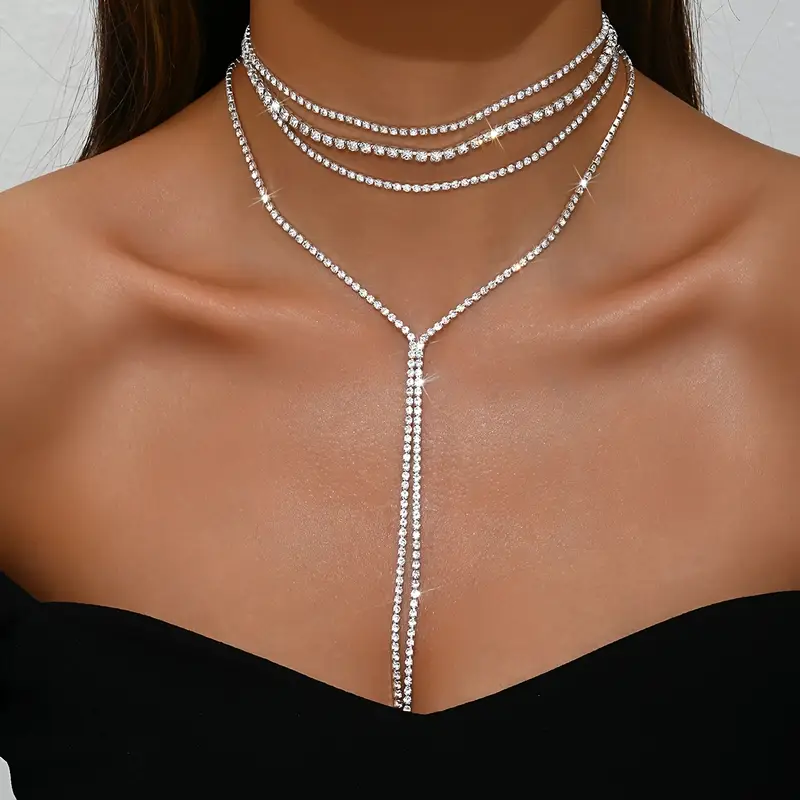 Acest colier multi strat impresionează prin suprapunerea armonioasă a lanțurilor, creând un efect vizual sofisticat și bine echilibrat. Designul în mai multe straturi oferă volum și mișcare, evidențiind zona gâtului într-un mod delicat, dar expresiv.