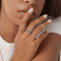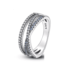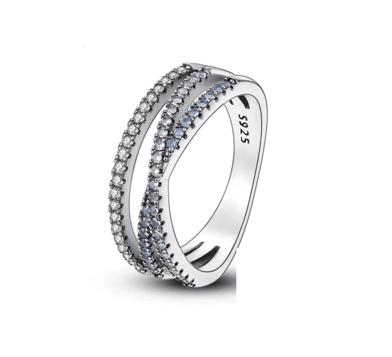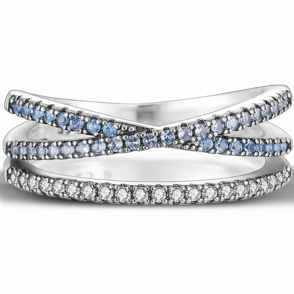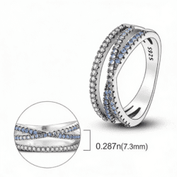 Inelul Diora Azure Elegance impresionează prin armonia celor trei rânduri de pietre fin montate, care creează un joc subtil de lumină și profunzime. Banda elegantă este pusă în valoare de contrastul cutre nuanțele albastre delicate și reflexiile clare, oferind un efect vizual echilibrat și rafinat.