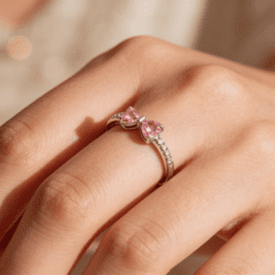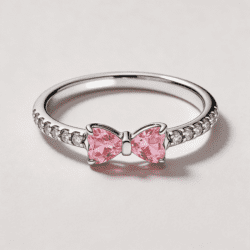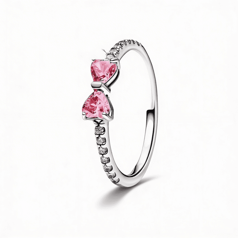 Acest inel impresionează prin forma sa armonioasă, inspirată cu eleganța unei fundițe, completată de accente roz strălucitoare. Detaliile atent realizate și proporțiile echilibrate oferă un aspect rafinat, potrivit pentru un stil feminin și modern.